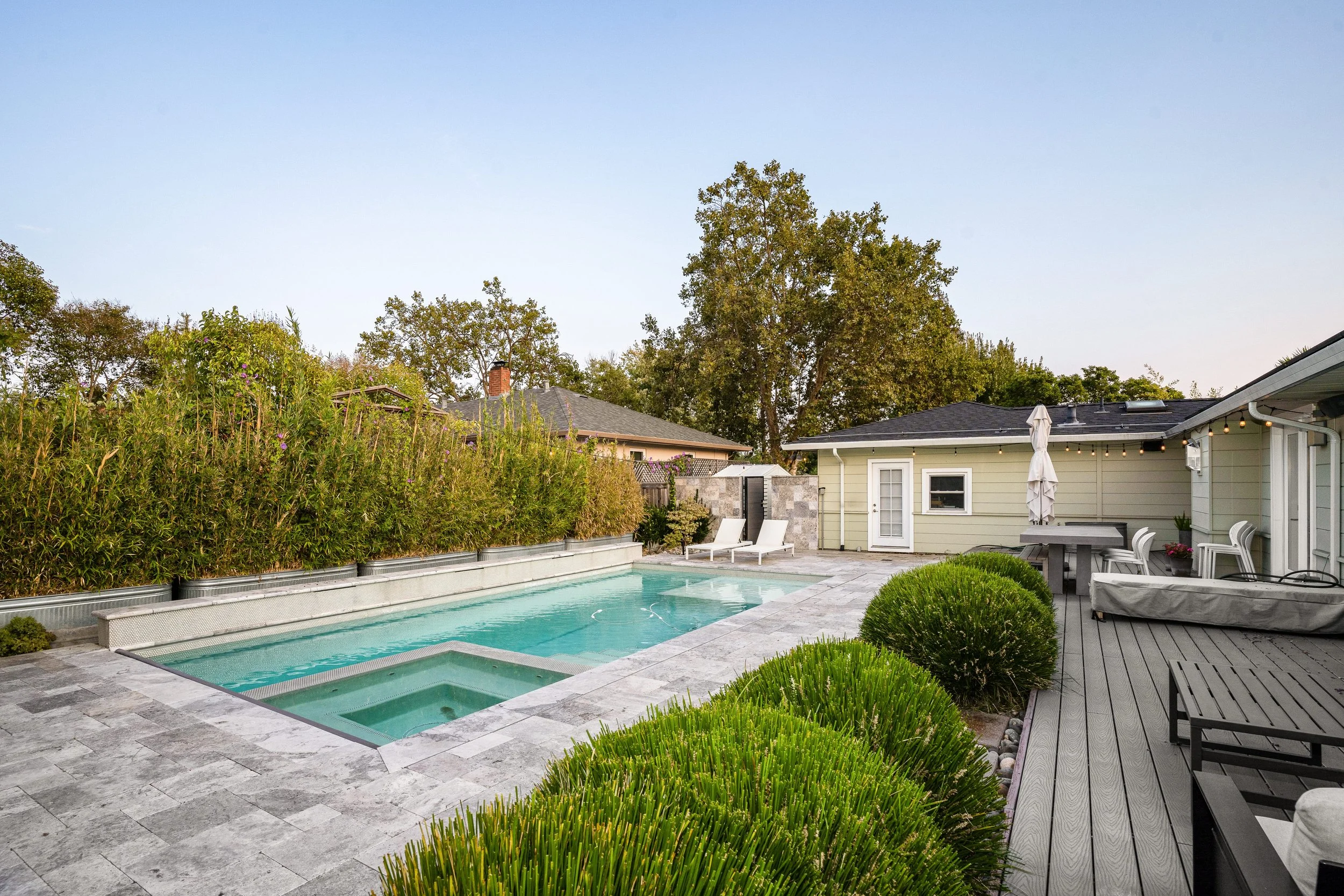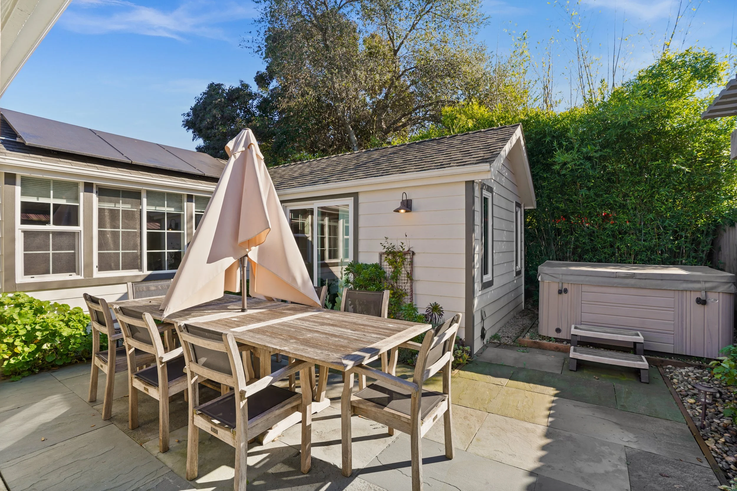 Step outside to a stunning backyard retreat featuring a private hot tub, multiple lounge areas, and lush surroundings, perfect for sipping wine under the stars or soaking up Napa’s sunny days with friends and family.